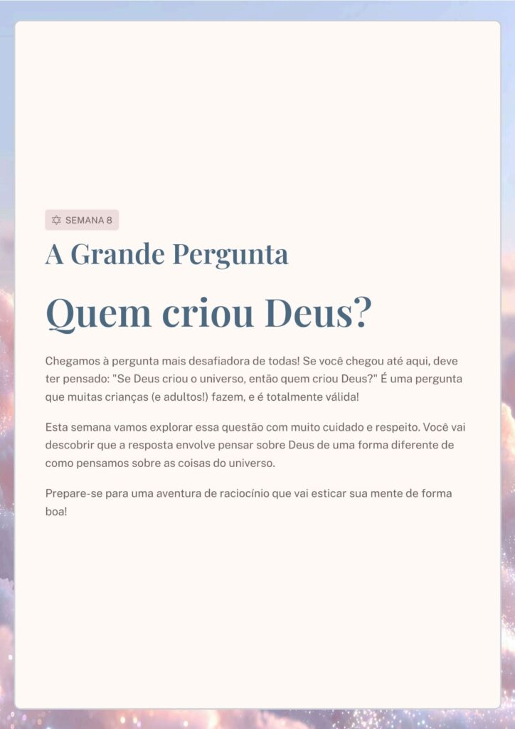 A série digital criada por apologistas, teólogos e psicólogos infantis para ensinar crianças de 8 a 14 anos a PENSAR a fé — não apenas repetir histórias bíblicas.