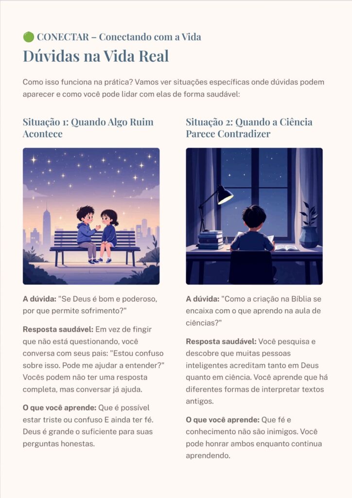 Não. O material ensina como pensar sobre a fé, não teologia acadêmica nem respostas prontas.